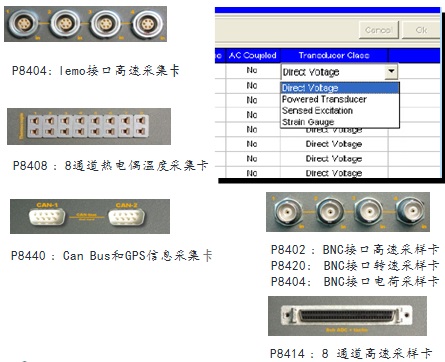 输入和输出卡种类齐全: 电压、IEPE (ICP®)、电荷、精密转速测量、电桥、温度、CAN总线、GPS 等信息和数据采集卡 和 D/A信号输出卡。