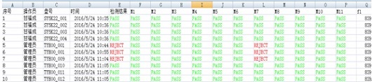 ((左端开始,第1列表明有1-10共10次试验。第2列是试验用户。第三列是盘号。 第4列是测试日期和时间。第5列是测试结果,如果合格就是绿色的PASS;如果不合格就是红色的REJECT。第6-17列为每个固有频率是否合格。后面的多列可选:固有频率、Q因子等。 每次试验一行数据。)
