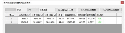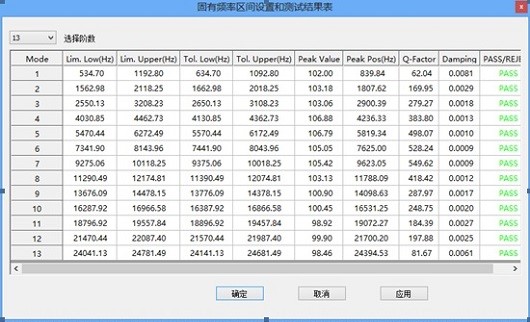 (左端开始,第1列表明有1-12阶固有频率。第8列是固有频率。第9列是Q因子。第10列是阻尼系数。 第5,6列为公差的下、上限,用于判断工件是否合格,判断结果放在最后一列,如果合格就是绿色的PASS;如果不合格就是红色的REJECT。每次试验敲击后,均会产生这个列表。 )