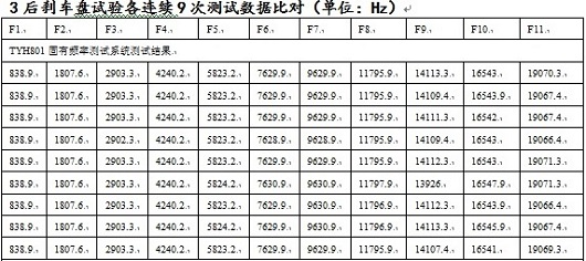 图2 一个刹车盘固有频率试验结果表